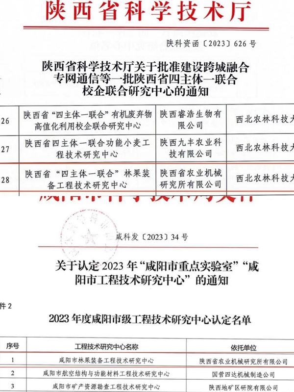 新年伊始,從陜西省科學(xué)技術(shù)廳、咸陽市科技局分別傳來喜訊,根據(jù)《陜西省工程技術(shù)研究中心管理辦法》(陜科發(fā)[2022]4號)、《陜西省科技廳支持校企合作共建新型研發(fā)平臺工作指引》(陜科發(fā)[2016]11號)的有關(guān)規(guī)定,省科技廳同意組建以我公司為依托,聯(lián)合西北農(nóng)林科技大學(xué)共建“陜西省‘四主體一聯(lián)合’林果裝備校企聯(lián)合研究中心”。同時,市科技局根據(jù)《咸陽市工程技術(shù)研究中心認(rèn)定管理辦法》的有關(guān)規(guī)定,認(rèn)定我公司咸陽市林果裝備工程技術(shù)研究中心為“市級工程技術(shù)研究中心”。
