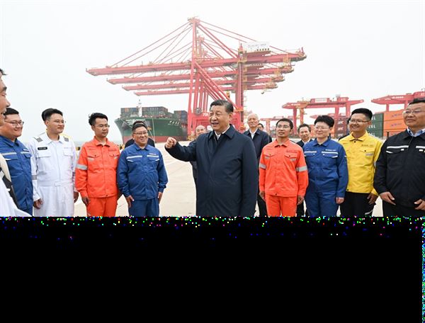 22日下午,習(xí)近平首先來到日照港考察。日照港是重要的能源和大宗原材料中轉(zhuǎn)基地,近年來推進(jìn)智慧化、綠色化建設(shè),建成順岸開放式全自動化集裝箱碼頭。習(xí)近平聽取山東省港口發(fā)展建設(shè)和日照港規(guī)劃布局等情況介紹,并察看全自動化集裝箱碼頭作業(yè)場景。他說,日照港是改革開放后新建的港口,近年來推進(jìn)科技創(chuàng)新,將傳統(tǒng)港口改造升級為現(xiàn)代化港口,不僅貨物吞吐量躋身全國前列,還積累了通過傳統(tǒng)產(chǎn)業(yè)改造升級發(fā)展新質(zhì)生產(chǎn)力的經(jīng)驗(yàn),值得肯定。習(xí)近平親切慰問港口科技工作者、運(yùn)營人員、航運(yùn)人員,希望大家再接再厲、繼續(xù)奮斗,推動日照港管理運(yùn)營更上一層樓。