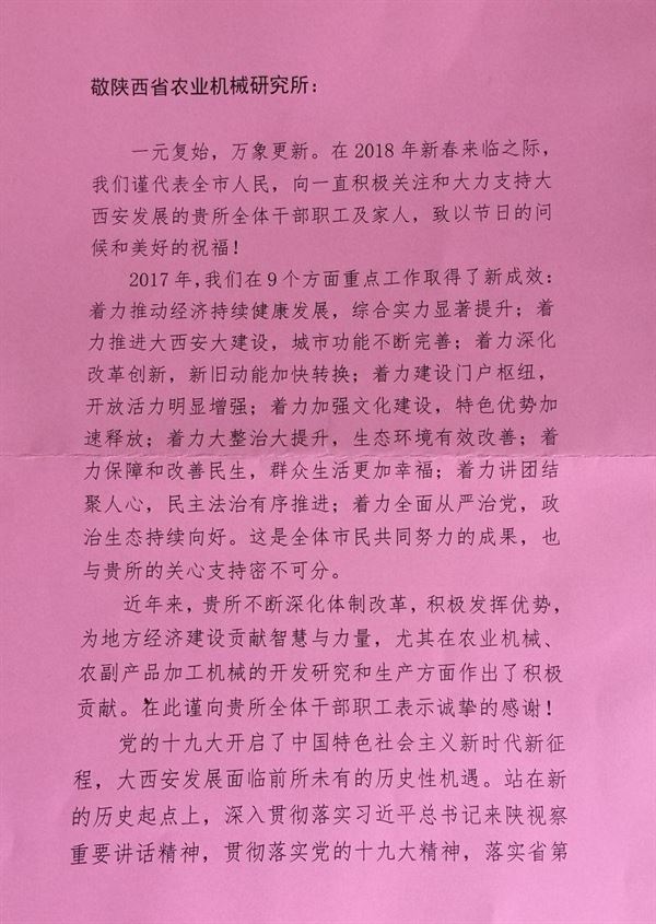 正值新春來臨之際,中共西安市委、西安市人民政府派員專程對我所進行慰問并送上新春的祝福,我們將一如既往地關(guān)注和支持大西安的發(fā)展,為我省農(nóng)機行業(yè)做出應(yīng)有的貢獻。