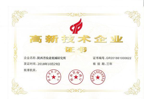 陜西省農(nóng)業(yè)機(jī)械研究所通過(guò)國(guó)家高新技術(shù)企業(yè)認(rèn)定,成為陜西省2018年公布的第一批國(guó)家高新技術(shù)企業(yè)。通過(guò)國(guó)家高新技術(shù)企業(yè)認(rèn)定后,我所將獲得國(guó)家相關(guān)政策支持,為產(chǎn)品結(jié)構(gòu)調(diào)整、持續(xù)發(fā)展帶來(lái)新的機(jī)遇。