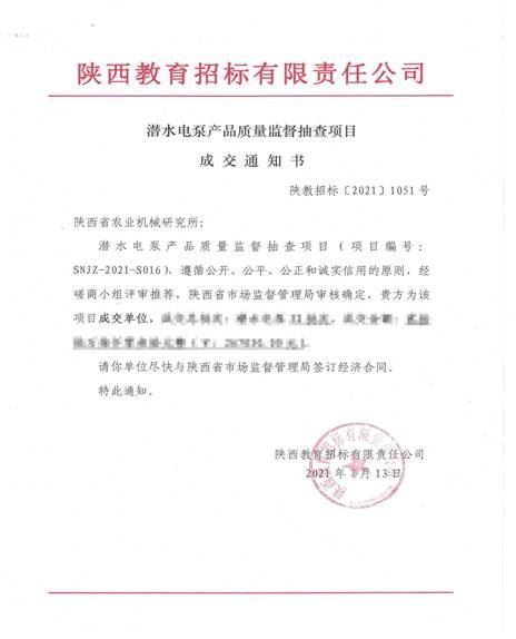 陜西省農機質檢總站成功中標2021年潛水電泵質量監(jiān)督抽查項目