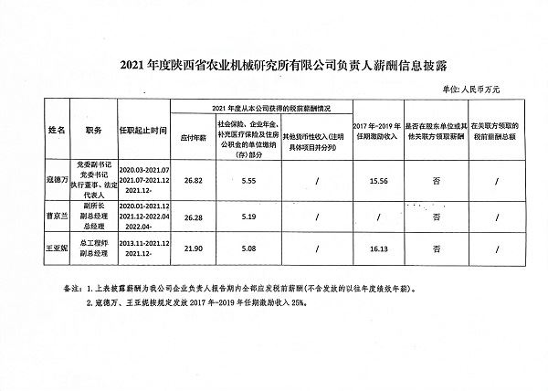 2021年度陜西省農(nóng)業(yè)機械研究所有限公司負責人薪酬信息披露