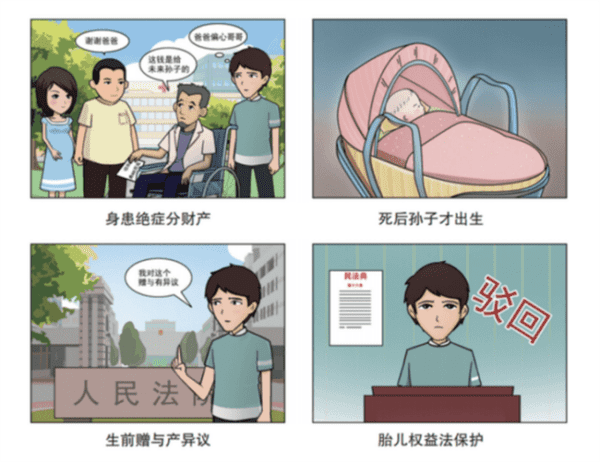 《中華人民共和國(guó)民法典》第16條:涉及遺產(chǎn)繼承、接受贈(zèng)與等胎兒利益保護(hù)的,胎兒視為具有民事權(quán)利能力。但是,胎兒娩出時(shí)為死體的,其民事權(quán)利能力自始不存在