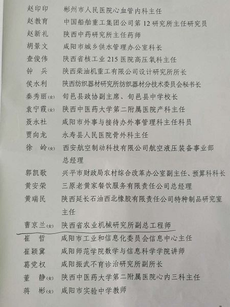 陜西省農(nóng)業(yè)機(jī)械研究所副總工程師、質(zhì)檢總站副站長、高級工程師曹京蘭同志榮獲咸陽市首屆“最美同心人”榮譽稱號。