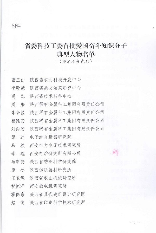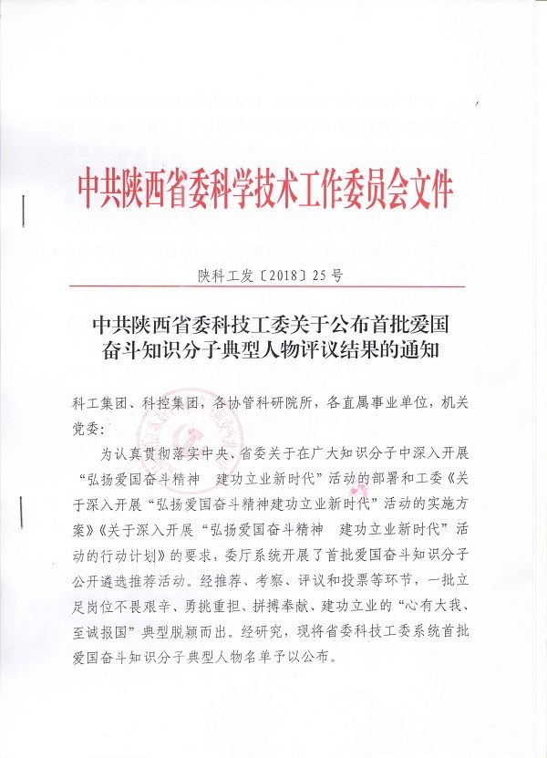 根據(jù)《中共陜西省委科技工委關(guān)于公布首批愛國奮斗知識分子典型人物評議結(jié)果的通知》(陜科工發(fā)[2018]25號)文件通知,我所總工程師王亞妮同志被評為省委科技工委系統(tǒng)首批愛國奮斗知識分子典型人物。