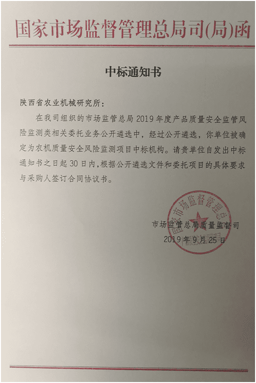 中標(biāo)|陜西省農(nóng)業(yè)機(jī)械研究所將承擔(dān)國(guó)家市場(chǎng)監(jiān)管總局質(zhì)量監(jiān)督司2019年度國(guó)家農(nóng)機(jī)產(chǎn)品質(zhì)量安全監(jiān)管風(fēng)險(xiǎn)監(jiān)測(cè)項(xiàng)目